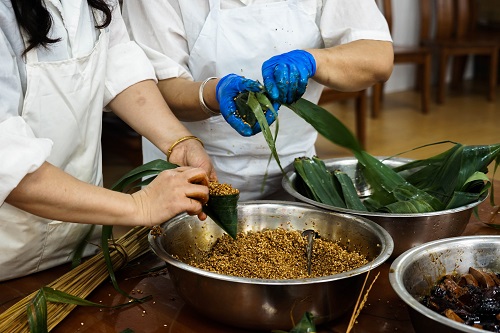 清新的粽葉香陣陣撲鼻,糯米、豬肉等食材整整齊齊地擺放在桌面(miàn)上。食堂阿姨一邊講解,一邊手把手教大家包粽子的方法。拿起(qǐ)粽葉,錯開(kāi)折疊成(chéng)漏鬥狀,放入糯米和豬肉,壓實後(hòu)把粽葉合攏,最後(hòu)用草繩將(jiāng)粽子捆紮系緊,一個大肉粽就(jiù)這(zhè)樣完成(chéng)了。