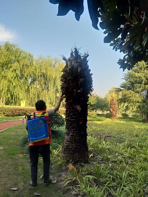 由于棕榈科植物長(cháng)得比較高大,而危害部位多在生長(cháng)點,噴藥時(shí)操作難度大,灌藥防治難度更大,藥物難滲透。不僅如此,紅棕象甲在化蛹前結繭,繭很厚,加上其在蛀食棕榈科植物時(shí)排出樹屑、蟲糞等。因此,在打藥水時(shí)采取從頭噴灌的方式,讓藥水盡可能(néng)多進(jìn)入樹幹。在藥水的具體配比上是:瑞廣(200g)、吡蟲啉(250g)、噻蟲啉(250g)配30斤水。打藥的周期是每間隔4天打一次。