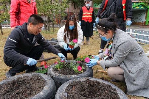 活動現場,每位團員青年都(dōu)有條不紊地忙碌著(zhe),他們有的取下原有的枯萎花草,有的搬運礬根、矮牽牛等新換植物,有的將(jiāng)其種(zhǒng)植、擺放至花籃中,使其看上去美觀、有序。