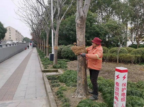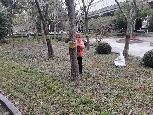 栾多态毛蚜在冬季會(huì)尋找暖和的地方越冬産卵,利用這(zhè)個習性,在樹幹中間部位打幾圈草繩,營造出越冬的理想場所,開(kāi)春後(hòu)再將(jiāng)草繩取下來進(jìn)行集中銷毀。傳統藥物防治污染大,而且害蟲易産生抗藥性,因此施行這(zhè)一更加環保的“新招”,減少越冬栾多态毛蚜的數量,從源頭上降低蟲子數量密度,達到滅蟲的目的。